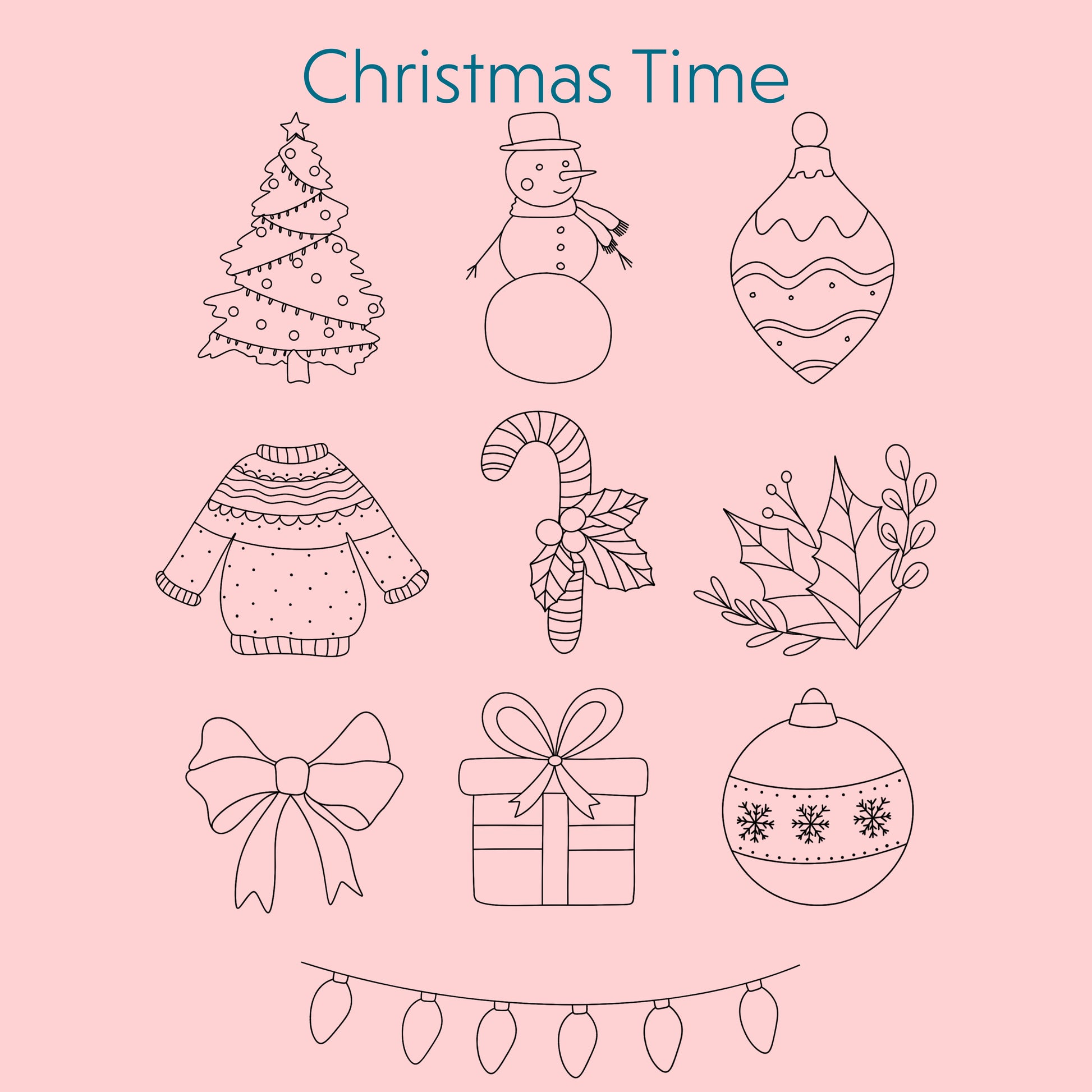 The designs featured in this pack are: Christmas tree, snowman, baubles, candy cane, present, string lights, bow, jumper, and holly.
