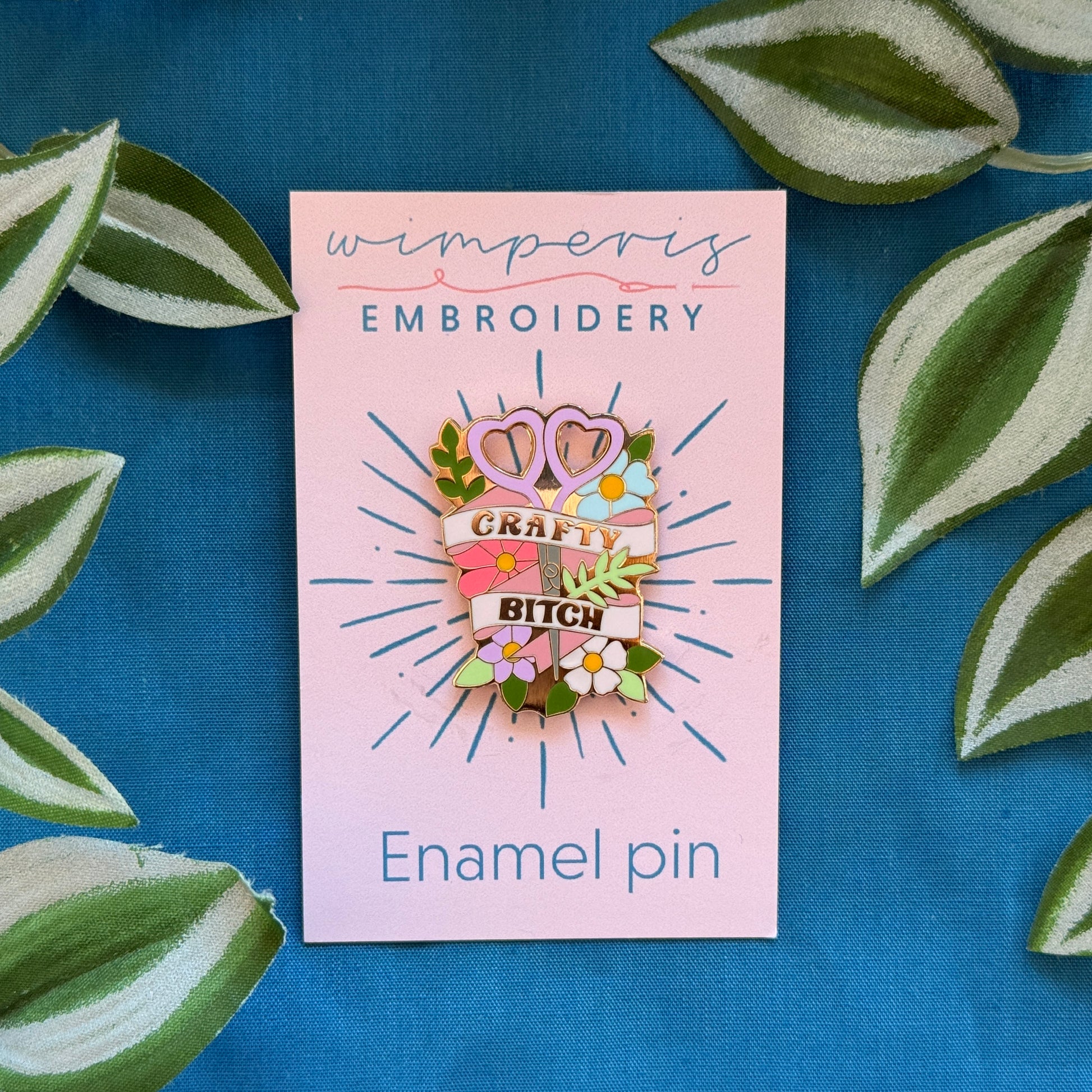 Let those around you know who you are - a crafty bitch! Based on my popular embroidery mini kit and featuring my token heart-shaped scissors and vibrant flowers. This design is also available as a needle minder and sticker.