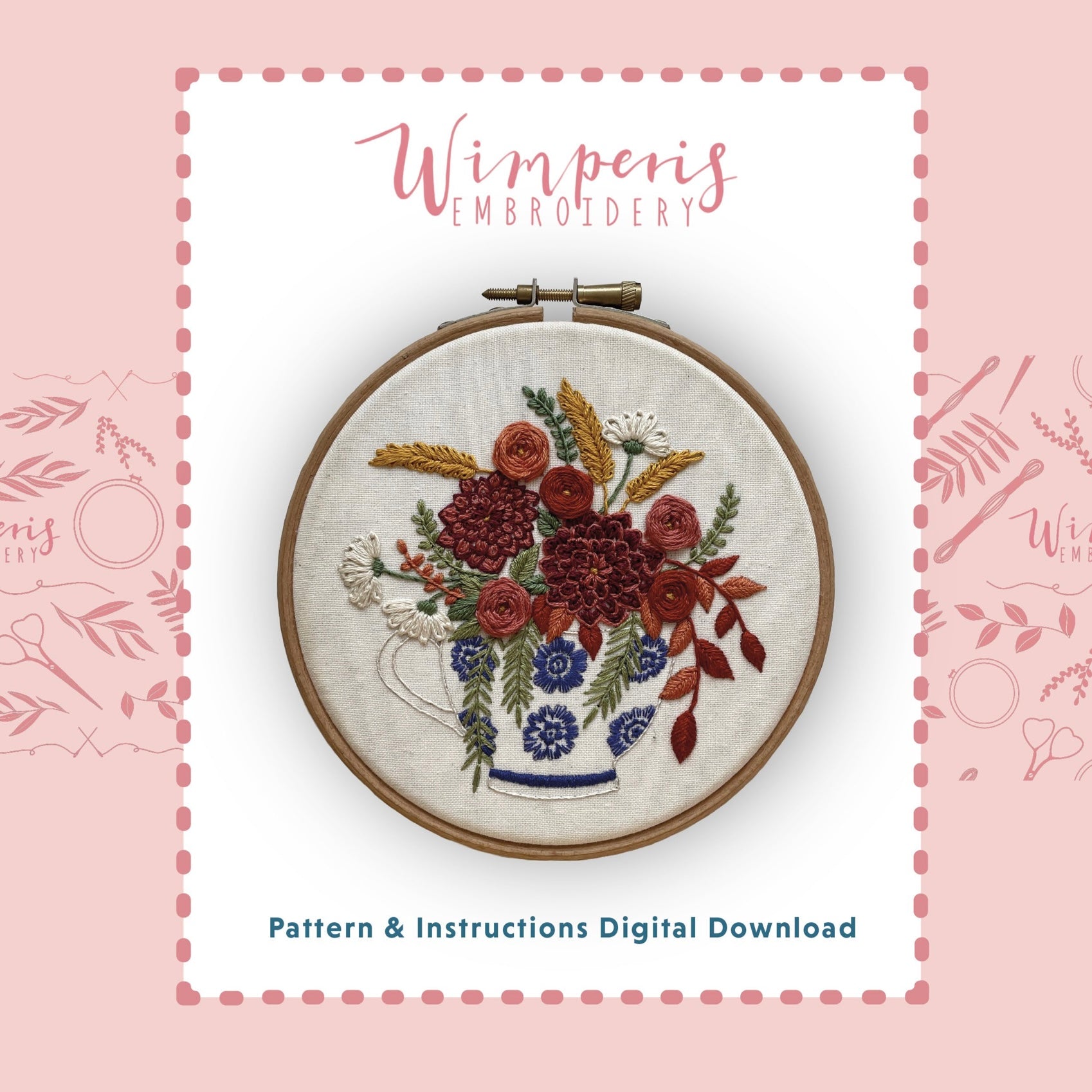 Stitch this stunning floral Teacup pattern and learn satin stitch, french knots, woven wheel roses, lazy daisies and herringbone stitch.