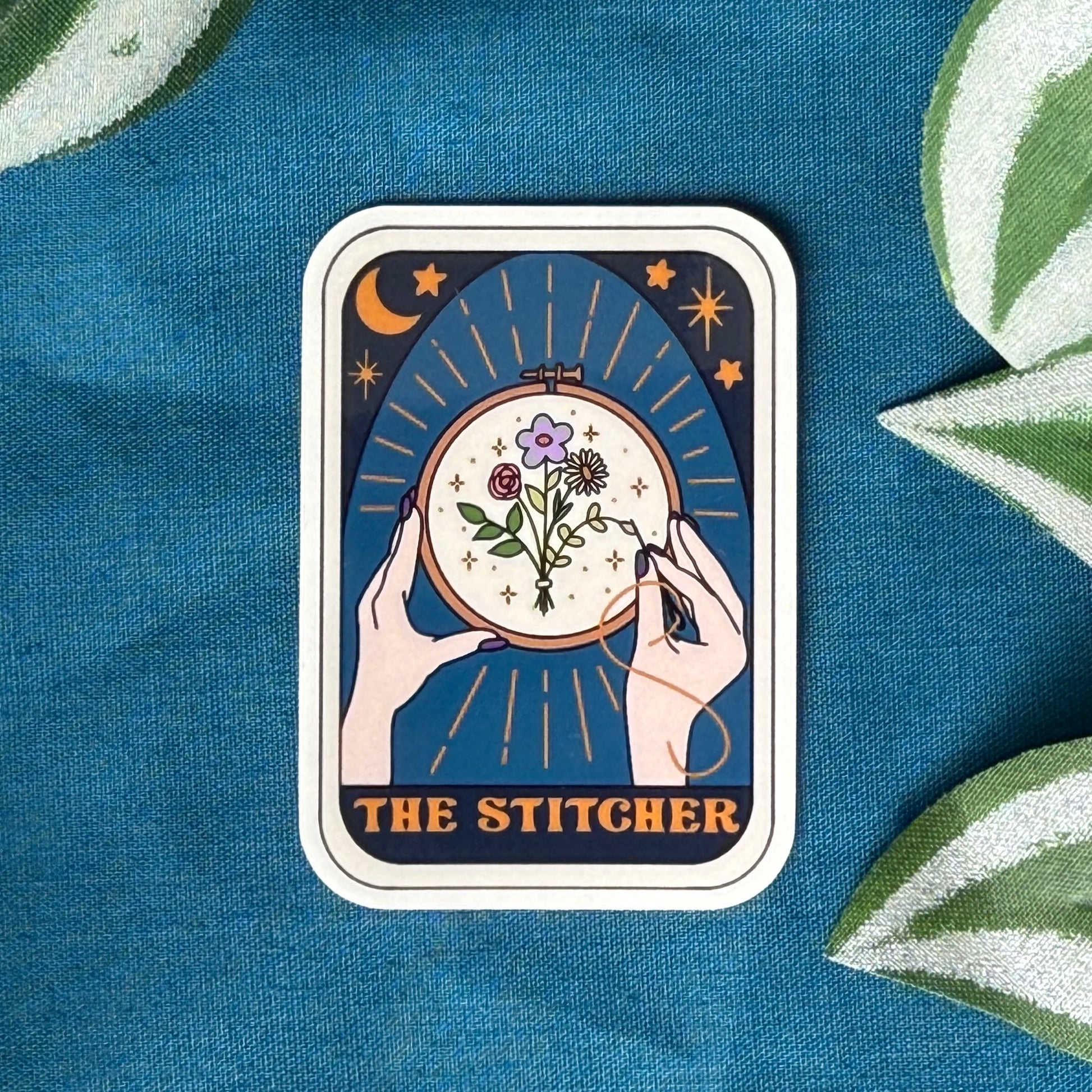 Let the cards guide you in your free time with "The Stitcher" tarot card sticker design.